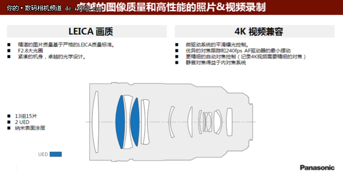 该镜头严格按照LEICA的质量标准,共13组15片镜片,其中包括2个UED(超低色散)镜片。UED镜片和松下尖端光学技术的结合,有效抑制了失真和色差,实现中心到边缘的高分辨率和高对比度图像质量。