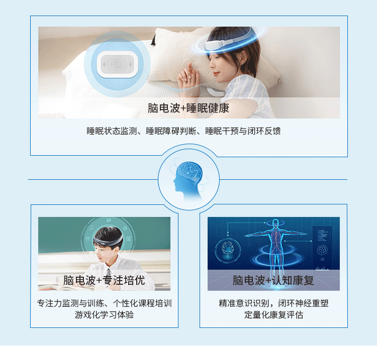 u 睡眠健康领域:实时采集高精度脑电数据,客观量化睡眠状态,AI根据脑电特征自动分析睡眠问题,触发匹配的干预方案,形成"监测-分析-干预-再优化"的智能循环。